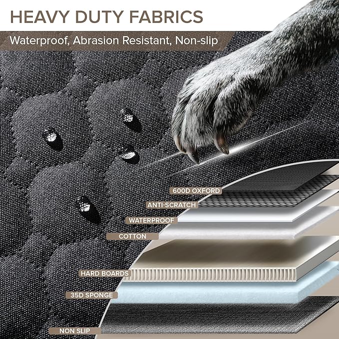 - 7-LAYERED CONSTRUCTION FOR SUPERIOR SUPPORT AND COMFORT - Crafted from durable materials 600D scratch-resistant Oxford cloth, waterproof fabric, reinforced hard bottom boards, 35D soft sponge, and cotton layers, this truck seat cover for dogs offers comfort and a non-slip surface. It shields your truck from damage, with an extra-high door flap to prevent scratches, allowing dogs to enter and exit without hassle