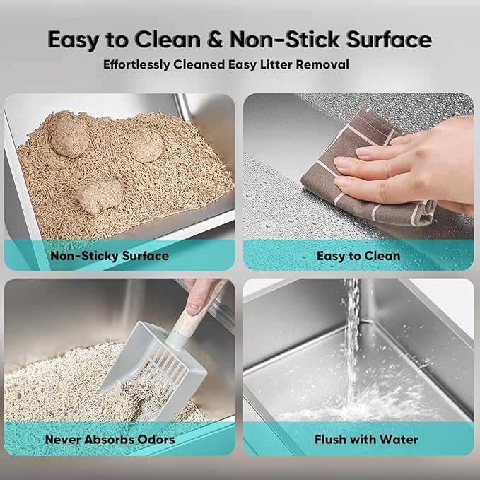 - Easy to Clean and Odorless: Nonstick surface of the litter box with lid makes cleaning a piece of cake, as waste slides out effortlessly with a quick rinse of water. Sturdy stainless steel won't get rusts and scratches where odor can harbor like the plastic litter box does, creating a clean and hygienic environment for your cats