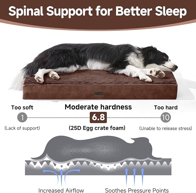 - 【Orthopedic Support】Engineered with high-resiliency 25D egg-crate foam, this bed delivers targeted orthopedic relief. It evenly distributes weight to alleviate strain on pressure points along the spine, hips, and joints—ideal for older dogs, large breeds, or pets with arthritis. Helps improve comfort and sleep quality.