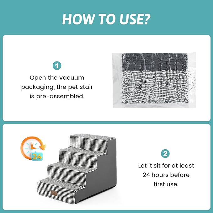 - Easy to Use: Dog stairs are vacuum-compressed and packed together after assembly, so after taking it out of the vacuum-sealed package, please let the sponge sit for 48 hours to fully expand before use. Slight wrinkles on the cover sides may appear after unpacking but can be smoothed out by washing or ironing