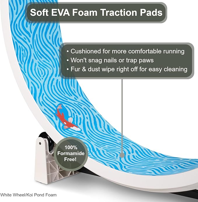 - TRACTION PADS - The interior of the wheel is lined with adhesive pads to provide traction. Comes in two options: Foam or Felt. The foam is super soft and easy to keep clean, but will show scratch marks faster. The felt is more durable against claw marks and scratches, but fur sticks to it more easily. Koi Pond pads are made from foam.