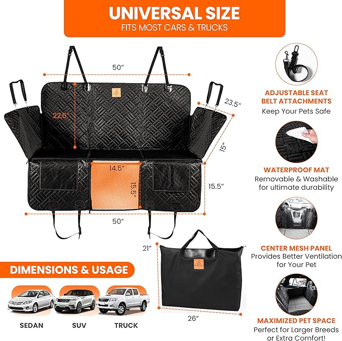 - Ultimate Protection for Your Car - Protect your car with this backseat dog cover hard bottom. Made to prevent scratches, spills, and muddy paws, this backseat cover for dogs in car is waterproof and durable. Use it as a car seat protector for dogs or a dog cover for car backseat to keep interiors looking spotless. Whether you’re using it as a dog car seat cover for back seat hard bottom or a seat cover for dogs in car, it’s the perfect solution for pet owners who want style, practicality, and a cleaner car.