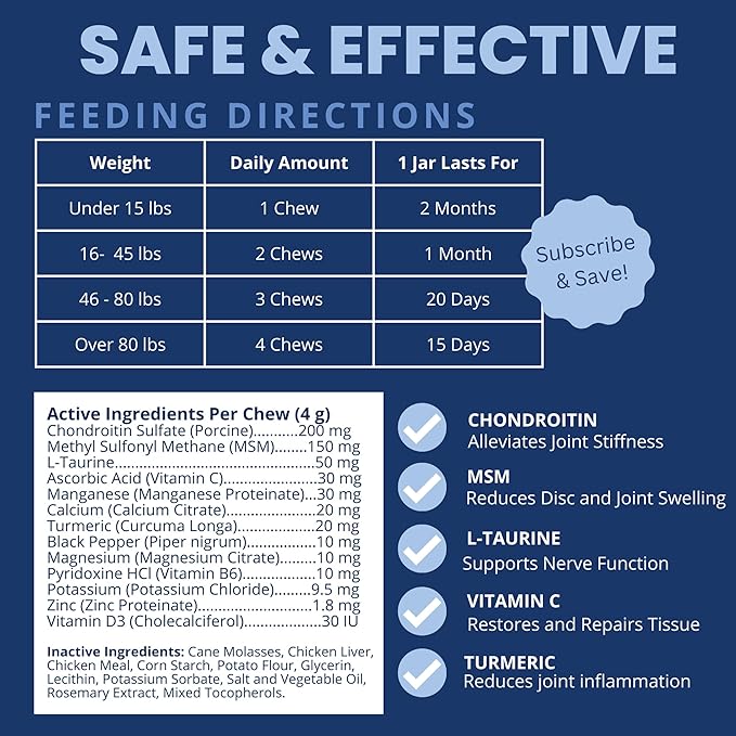 - Powerful Ingredients for Joint & Disc Health: Each chew combines Chondroitin, MSM, and Turmeric to provide targeted neck and back support. Chondroitin nourishes cartilage for improved joint function, while MSM offers natural anti-inflammatory benefits to reduce disc swelling. Turmeric further supports immunity, keeping your dog feeling their best.
