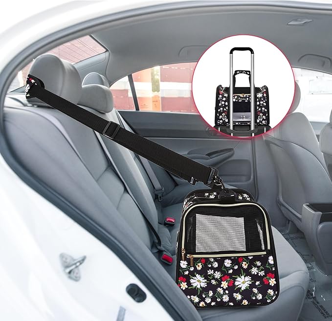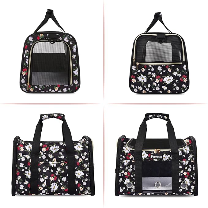 Petmolico Cat Carrier Dog Carrier, Airline Approved Soft Pet Travel Carrier with 3 Open Doors Mesh Windows for Cats Puppy 16 lbs, White Daisy