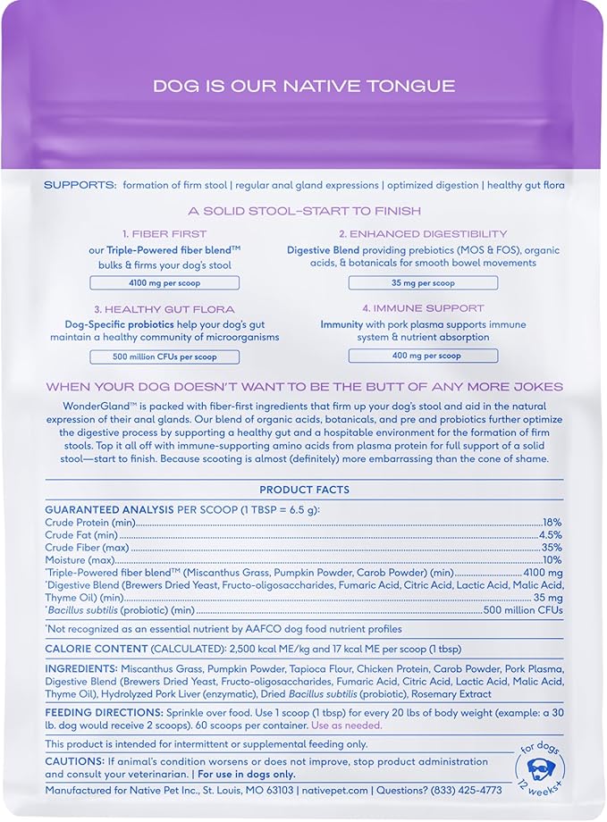 Native Pet WonderGland - Dog Anal Gland Treatment Using Fiber for Dogs - Prevents Scooting for Dogs Anal Gland Supplement Including Dog Gut Health Probiotics for Anal Gland Support - 60 Scoops