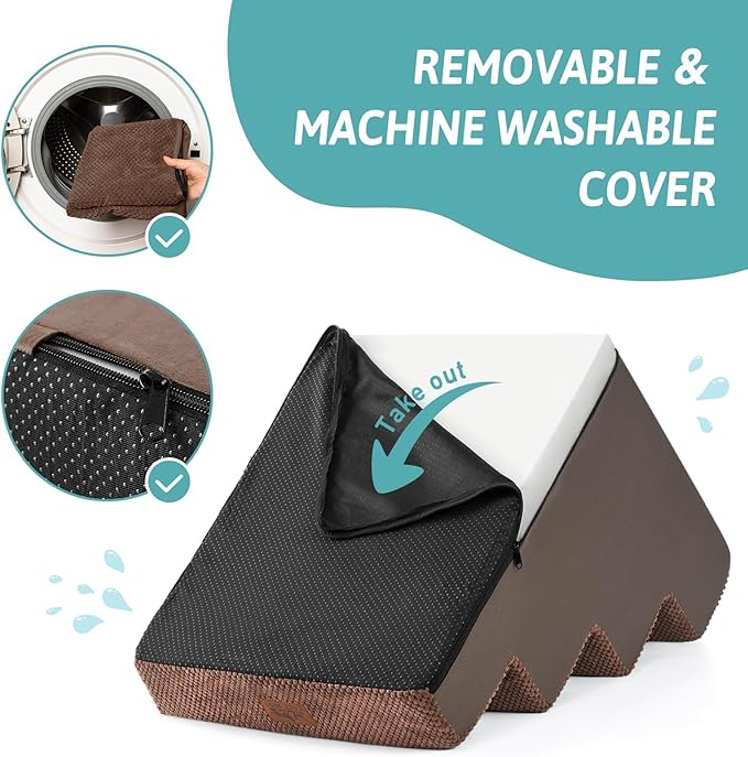 - Non-Slip Base and Removable Cover: Our dog steps for beds are equipped with a non-slip base featuring rubber dots for extra grip, minimizing movement during use. The pet steps cover is waterproof inner side, so you don’t have to worry about stains seeping into the foam. The outer cover is removable and machine washable for easy cleaning