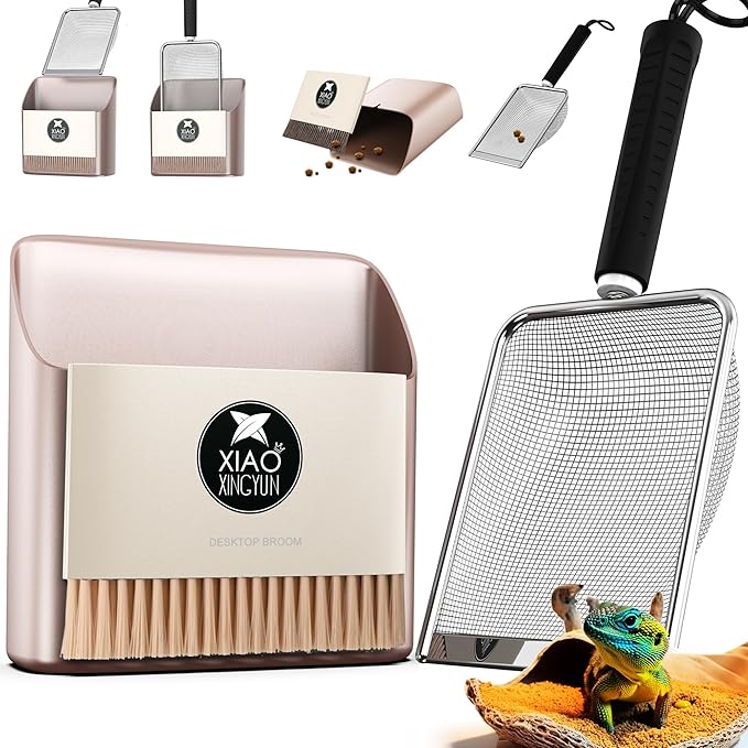 - HIDDEN STORAGE COMBO: The reptile sand scoop kit includes not only a metal litter scoop, but also a portable litter broom, dustpan and sticky hook. It not only helps you clean up the litter faster while cleaning, but also makes it easy to organize the litter scoop and broom after cleaning to keep it neat and tidy