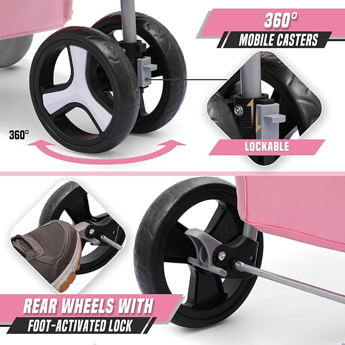 - 【Smooth Wheels and Safe Braking】 The 360°swiveling front wheel with a shock-absorbing ensuring smooth ride. The two rear wheels of our dog wagon are fitted with brake protection, allowing you to park safely even on sloped roads. It make our dog strollers ideal for injured, senior dogs, or puppies requiring extra care