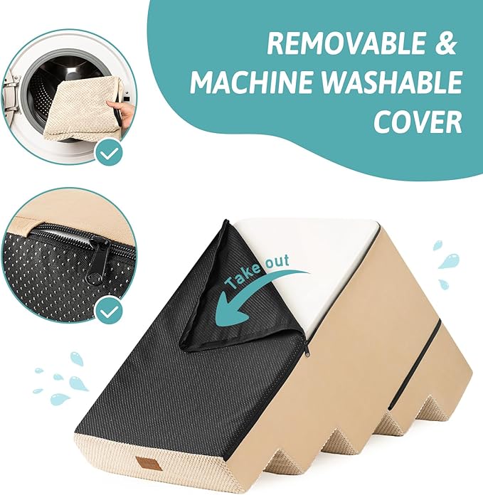 - Non-Slip Base and Removable Cover: Our dog steps for beds are equipped with a non-slip base featuring rubber dots for extra grip, minimizing movement during use. The pet steps cover is waterproof on the inner side, so you donโt have to worry about stains seeping into the foam. The outer cover is removable and machine washable for easy cleaning