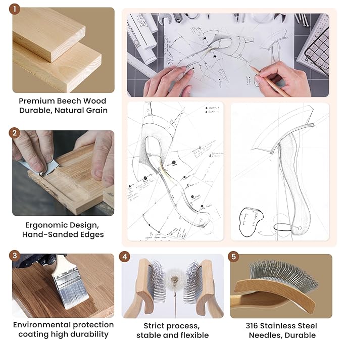 - Natural beech material - This slicker brush for dogs is made of strong and durable beech wood,anti-stamp and resistant to damage or deformation. Compared with plastic,it generates less static electricity,making the hair smoother and easier to manage while reducing shedding.The natural wood surface provides a comfortable grip and features a hanging rope for easy storage.Tip: Brush your pet’s fur at least three times a week to keep it clean,soft,and fluffy for the best grooming results