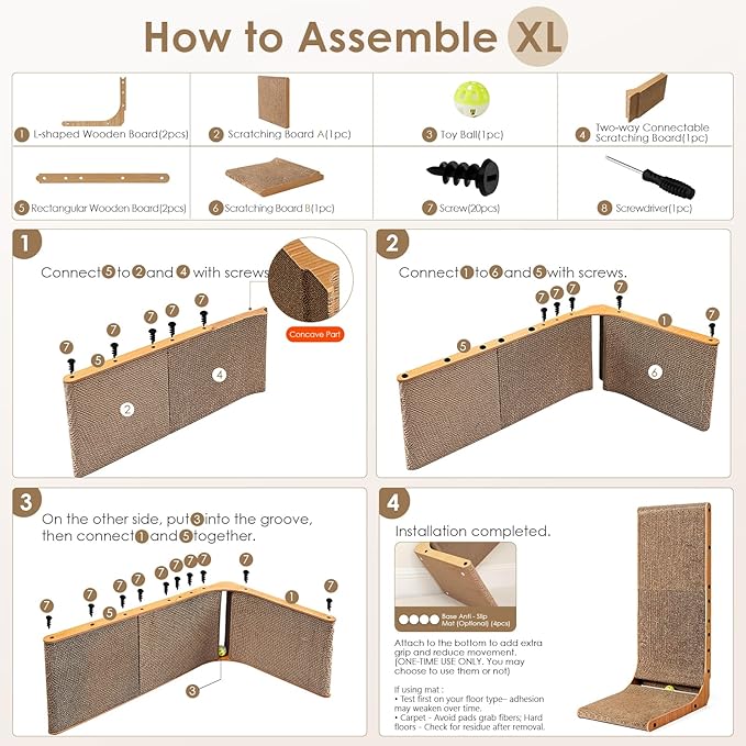 - EASY INSTALLATION: Our cat scratching board adopts a simple installation method and comes with instructions and necessary tools. We also provide an installation video so that you can install it quickly and easily.