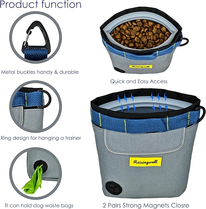 - 5.Durable Tech Material: Raisingwell's dog treat training pouch is made from durable, washable, and non-toxic fabric. Notably, its waterproof lining solves the problem of difficult-to-clean interiors of training bags, making it a great choice for your dog treat bag or dog treat fanny pack.