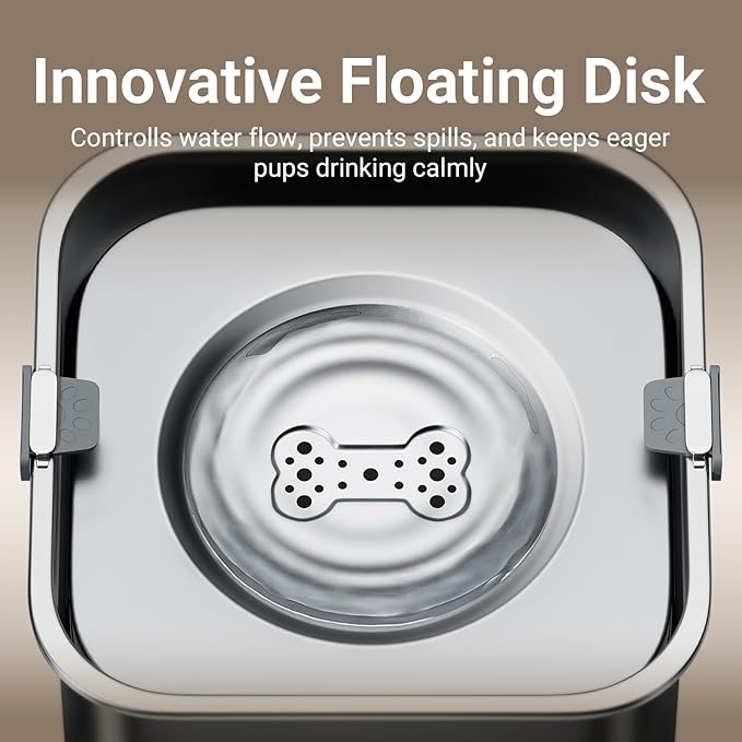 - Floating Disk Design: Controlled Water Flow for a Spill-Free Experience. The advanced floating disk design ensures a steady water flow, allowing your dog to drink easily without splashing.And keeping your dog's muzzle and fur dry while drinking. It prevents spills, keeps your floors dry, and creates a cleaner, more enjoyable environment.