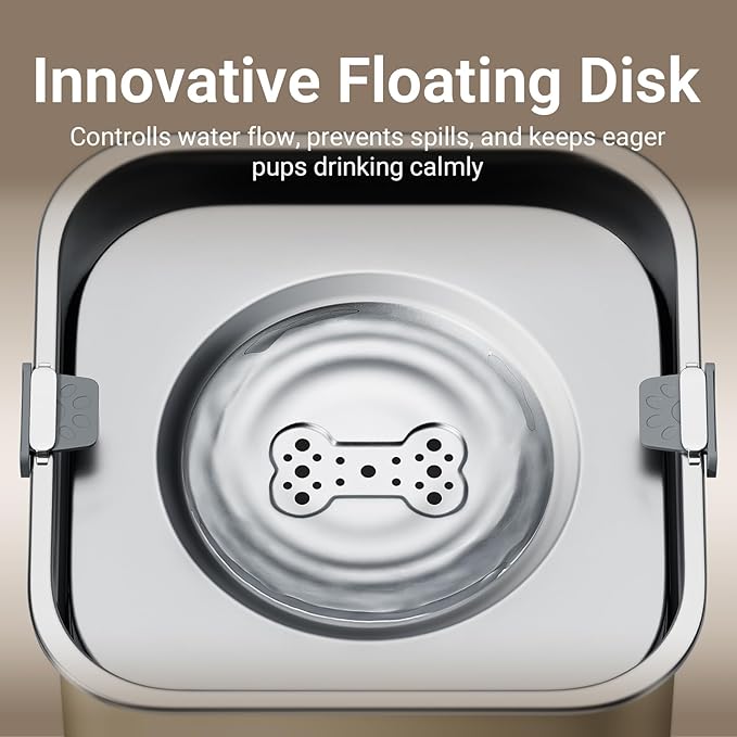 - Floating Disk Design: Controlled Water Flow for a Spill-Free Experience. The advanced floating disk design ensures a steady water flow, allowing your dog to drink easily without splashing.And keeping your dog's muzzle and fur dry while drinking. It prevents spills, keeps your floors dry, and creates a cleaner, more enjoyable environment.
