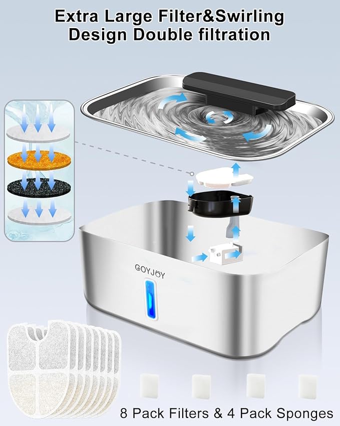 - 【Comes With 8 Pack Extra Filters】The stainless steel dog water fountain includes 8 pack extra filters,keep you using for a long time while save the cost of replacement filters.The larger filters can effectively dropping dirt debris and shedding fur,always provide clean and fresh water.Also the larger filters can extend the replacement time and save cost.Please search "B0DRVQSTCY" to buy replacement filters,"B0DYYFP7BP"to buy replacement pump.