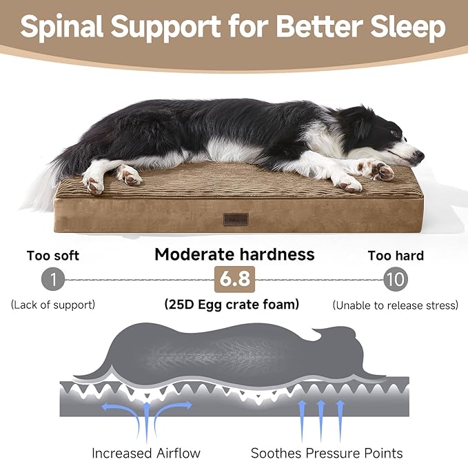 - 【Orthopedic Support】Engineered with high-resiliency 25D egg-crate foam, this bed delivers targeted orthopedic relief. It evenly distributes weight to alleviate strain on pressure points along the spine, hips, and joints—ideal for older dogs, large breeds, or pets with arthritis. Helps improve comfort and sleep quality.