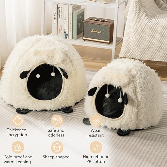 Cute Cat Bed Cave for Indoor Sheep Shaped Pet Plush House Self-Warming Nest Small Dogs Rabbits with Removable Cushion for Puppy Bed with Hanging Toy