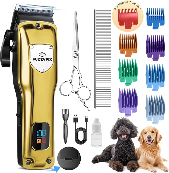 - 【What You Get】FuzzyFix professional dog grooming clippers Includes every thing you need, perfect for beginners! Package contains with Dog Clippers*1, Colorful Guide Comb*8(3, 6, 10, 13, 16, 19, 22, 25mm), Scissors*1, Steel Comb*1, Blade Oil*1, USB Cable*1, Cleaning Brush*1.