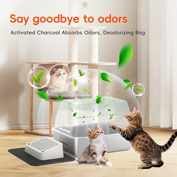 - 【Litter Collection & Odor Absorption】Dual protection from steps and litter mat traps spilled litter, keeping areas clean. The deodorizing compartment holds odor-absorbing granules or activated charcoal to quickly neutralize smells and reduce unpleasant odors.