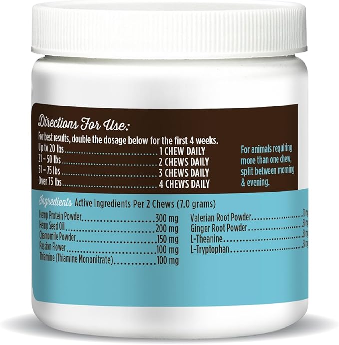 - Effective, All-Natural Ingredients - We load our calming treats with wholesome and effective ingredients like Chamomile, Theanine, L-Tryptophan and more. Valerian root is a homeopathic herb that can help relax your dog, put his fears to rest, and promote a sense of tranquility. We include only natural pet hemp for it's support of nervous system function. Omega 3 & 6 fatty acids for heart health, flexibility, and comfort, and Pre and Probiotics for optimal digestion.