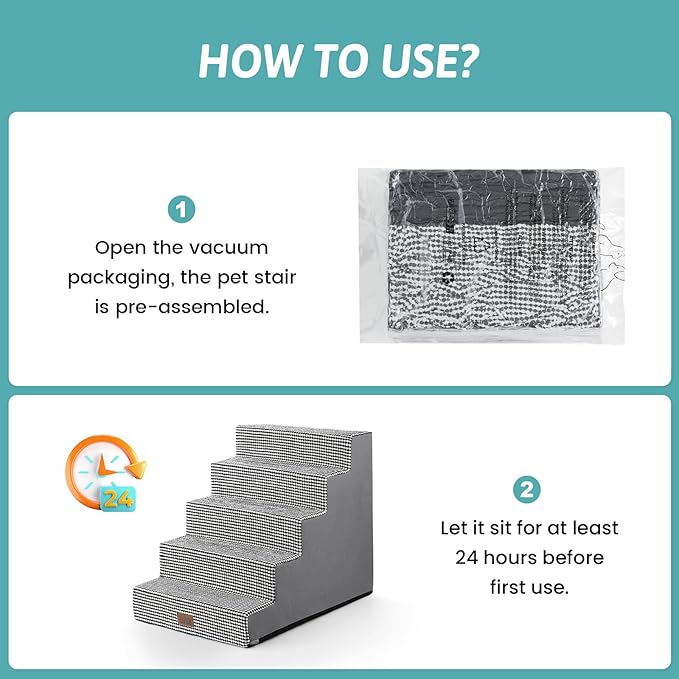 - Easy to Use: Dog stairs are vacuum-compressed and packed together after assembly, so after taking it out of the vacuum-sealed package, please let the sponge sit for 48 hours to fully expand before use. Slight wrinkles on the cover sides may appear after unpacking but can be smoothed out by washing or ironing