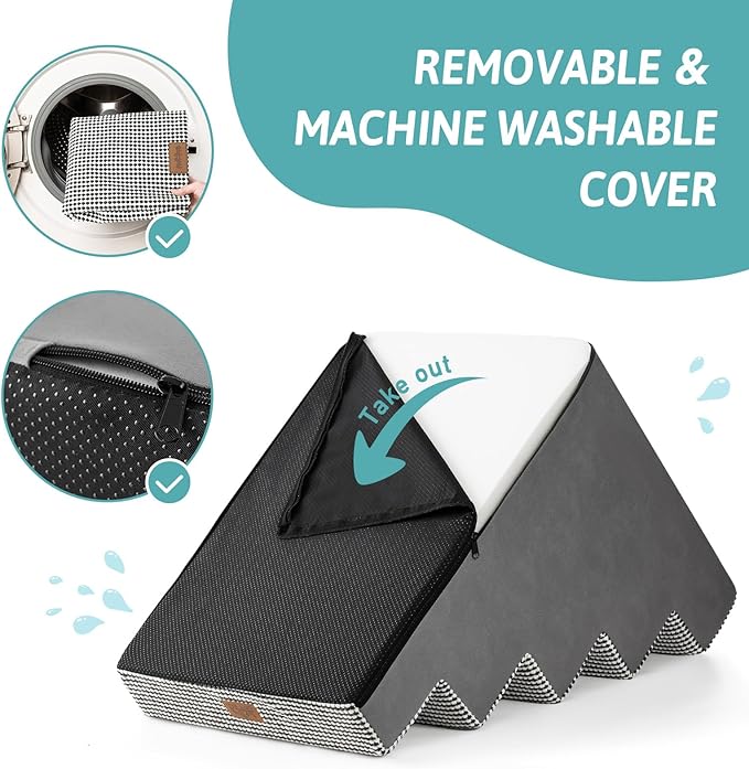 - Non-Slip Base and Removable Cover: Our dog steps for beds are equipped with a non-slip base featuring rubber dots for extra grip, minimizing movement during use. The pet steps cover is waterproof inner side, so you don’t have to worry about stains seeping into the foam. The outer cover is removable and machine washable for easy cleaning