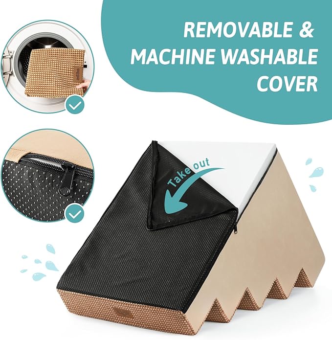 - Non-Slip Base and Removable Cover: Our dog steps for beds are equipped with a non-slip base featuring rubber dots for extra grip, minimizing movement during use. The pet steps cover is waterproof inner side, so you don’t have to worry about stains seeping into the foam. The outer cover is removable and machine washable for easy cleaning