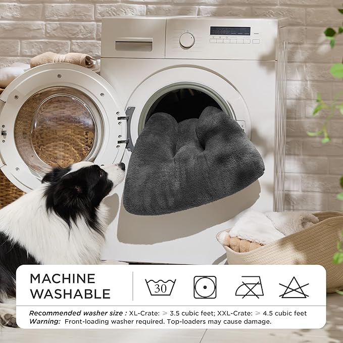 - Machine Washable: Our washable dog bed not only provides the cozy experience but is also effortless when it comes to maintenance. Simply machine wash in cold water and dry at a low temperature for consistent freshness at every use. (Care Instructions: ①For best results, please use a front-loading washer! Top-loading machines may cause damage. ②The washer should be larger than 3.5 cu. ft. for XL Crate and 4.5 cu. ft. for XXL Crate.)
