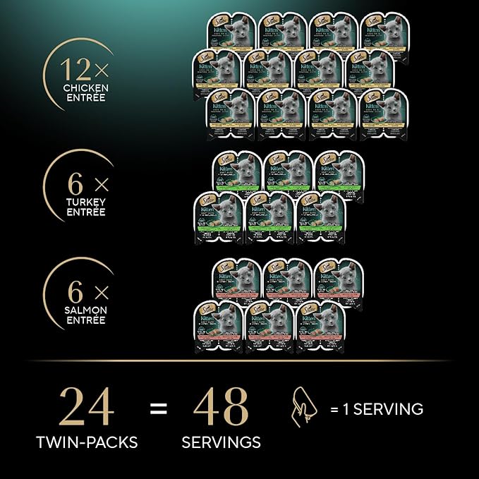 Sheba Perfect Portions Kitten Wet Cat Food Pate Chicken Entree, Salmon Entree, and Turkey Entree, 2.6 oz. Twin-Pack Trays (24 Count, 48 Servings)