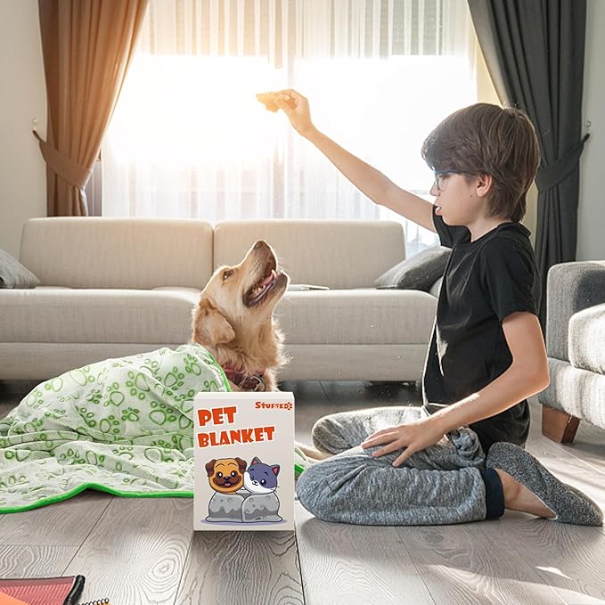- PREMIUM MATERIAL FOR PETS ONLY: Super Soft & Warm comfy fleece for your pets, exclusive cute paw prints design on the top, lovely solid green color on the back, no fear of peeing, bitting, chewing and tearing. Your dog will love this dog products! A good match for puppy toys