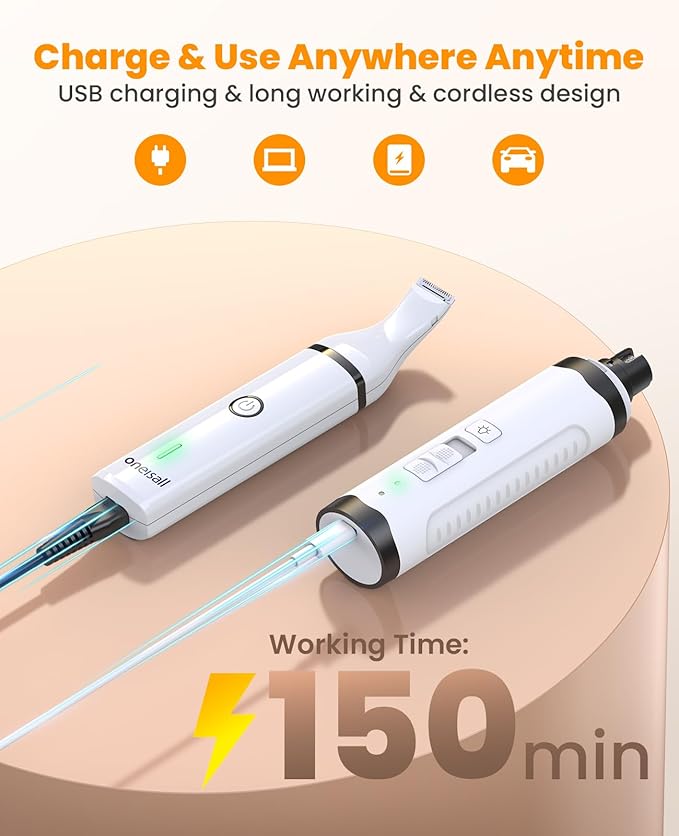 - 【USB Charging & Always Ready】: Say goodbye to constantly changing batteries. This handy kit is USB rechargeable, so you can charge it easily with your laptop or phone charger. The paw trimmer stays charged for up to 120 minutes, and the nail grinder keeps working for 150 minutes. It's convenient and ready when you need it.