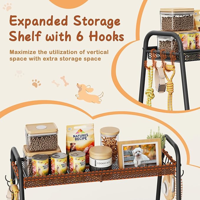 - 【Extra Top Shelf & 6 Hanging Hooks】The top shelf offers secure extra storage with surrounding guards to prevent items from tipping, ideal for storing dog food, treats, grooming tools, or display items like pet photos. Equipped with 3 hooks on each side, this dog basket for toys provides convenient hanging storage for dog collars, leashes, and other small essentials. This toy basket for dogs keeps everything within reach, making it easy to keep your space tidy and your pet's gear organized.