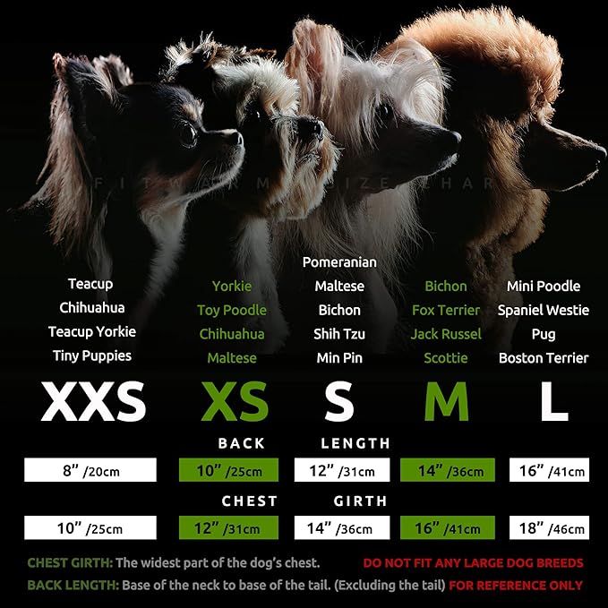 - FOR SMALL DOG BREEDS. Please priority follows the chest size. Size XSmall, fits 10" back, 12"chest. Recommended for: Chihuahua, Yorkshire Terrier, Toy Poodle, Maltese, Morkie, Pomeranian, Miniature Pinscher, tiny puppies and teacup breeds.