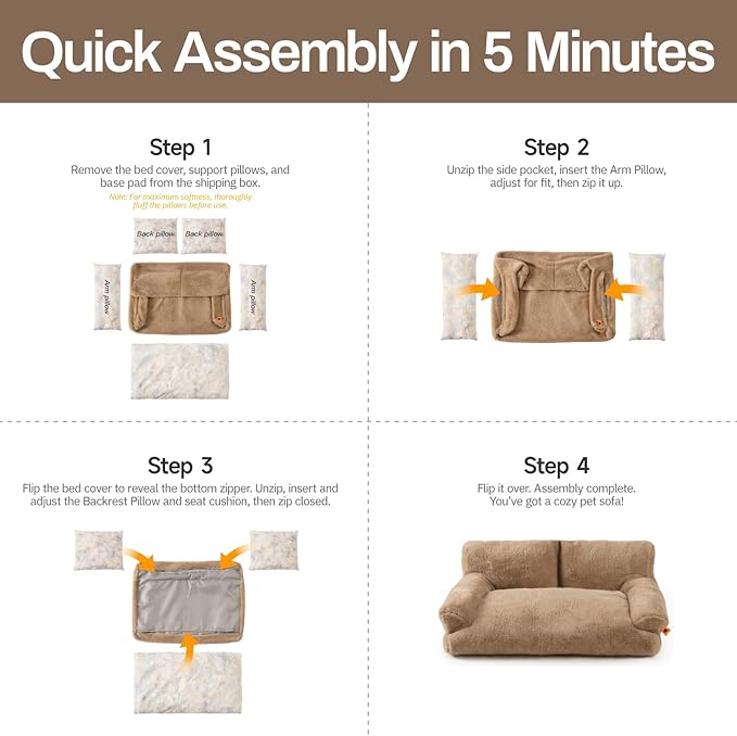 - 【Assemble Tips】Our pet bed arrives as a vacuum packed bed in a box, please pat to make the pet sofa completely fluffy before use, and wait for 48 hours after it, it will return to shape after shaking.