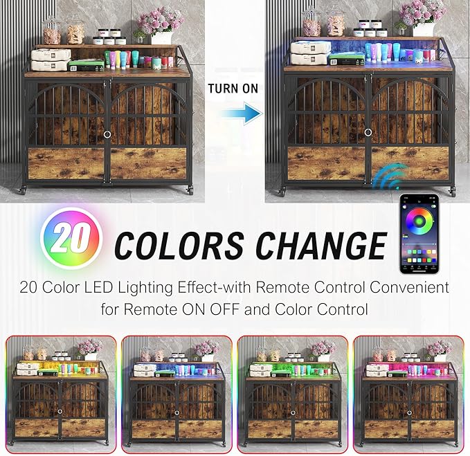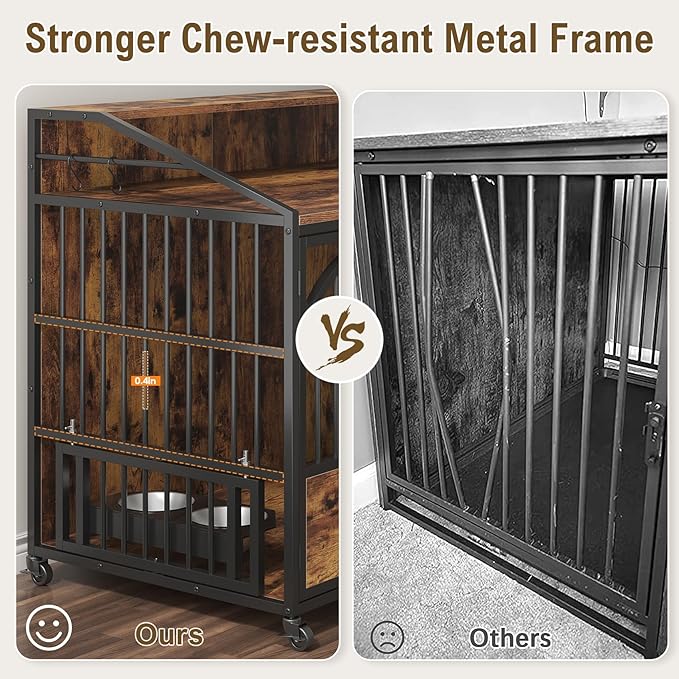 44 Inch Heavy Duty Dog Crate Furniture with 3 Doors, Dog Kennel with 360° Stainless Steel Bowls, Lockable Wheels, Wood Dog Cage End Table with Led Light, Pet Crate Dog Cage for Large/Medium/Small Dogs
