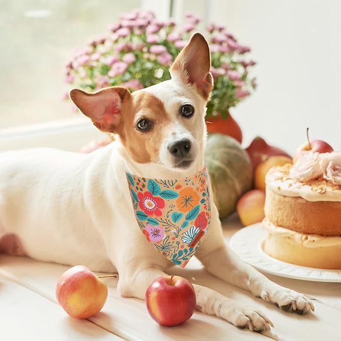 ADOGGYGO Floral Dog Bandana, Orange Green Flower Pet Scarf, Adjustable Fit Floral Bandanas for Medium Large Dogs Pets (Large)