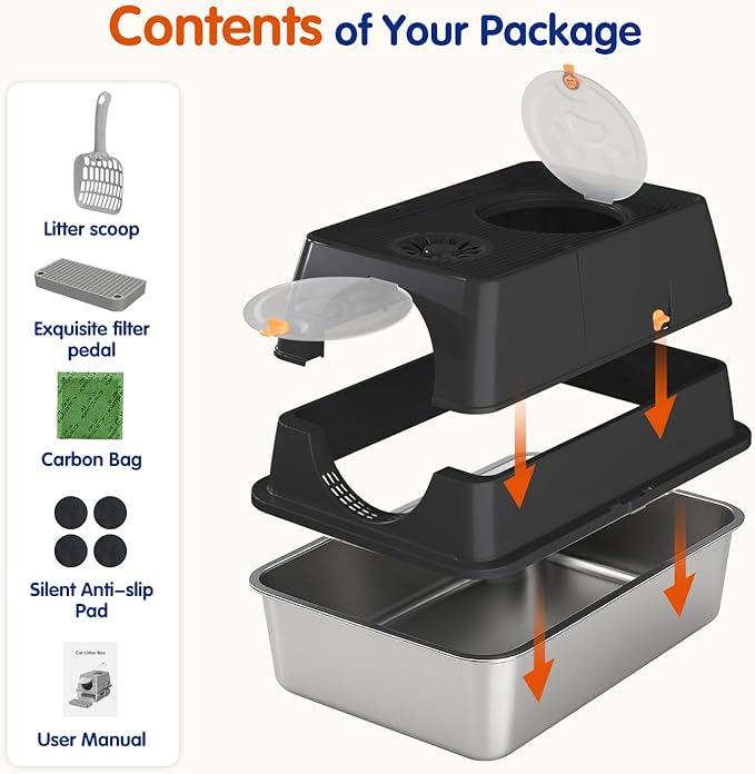 - What You Can Get: Litter box with lid, pedal, litter scoop, silent anti-slip pad, charcoal bag(features a dedicated compartment on top), instruction manual; 12-month warranty, 30-day return, 24/7 customer service; Please contact us anytime with questions