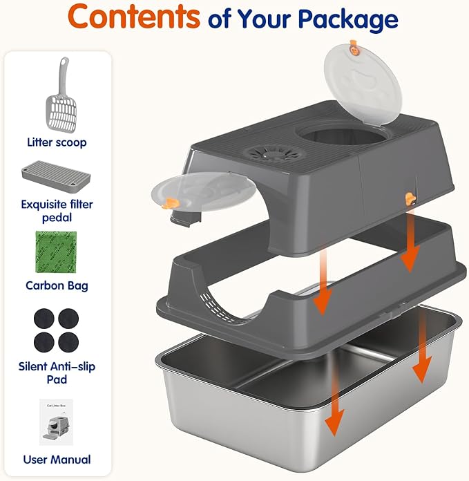 - What You Can Get: Litter box with lid, pedal, litter scoop, silent anti-slip pad, charcoal bag(features a dedicated compartment on top), instruction manual; 12-month warranty, 30-day return, 24/7 customer service; Please contact us anytime with questions