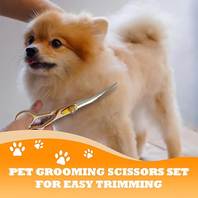 - 【Multi-Purpose】The adjustable screw allows you to fine-tune the tension of the blades, providing precise control based on your pet grooming needs. The curved shear is great for trimming details. The chunker shear is to thin the thick furll animals. The straight dog scissor is to cut long hair and fur on body.