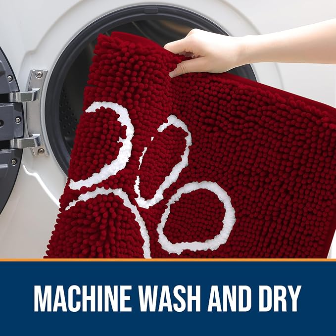 OLANLY Dog Door Mat for Muddy Paws 36x24, Paw Print Design, Absorbs Moisture and Dirt, Absorbent Non-Slip Washable Doormat, Quick Dry Chenille Mud Mat for Dogs, Entry Indoor Entryway Carpet, Red