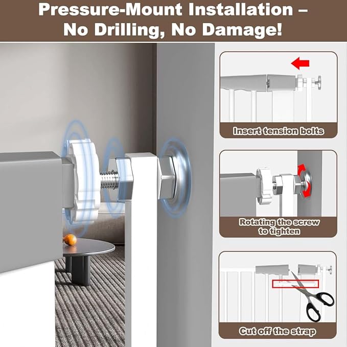 - 【Easy to Install and Remove】The pressure mounted dog gates indoor comes with 4 adjustable pressure bolts, it does not require drilling or tools, which significantly reduces setup time. The child gates for doorways provides a fast, secure way to control access without committing to permanent installations, suitable for renters, pet owners, and people in temporary living situations.