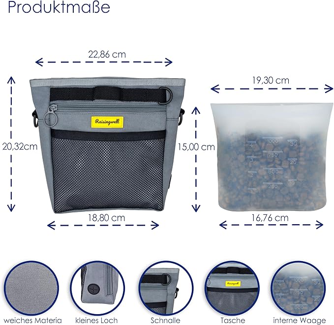 - 5.Durable Tech Material: Raisingwell's dog treat training pouch is made from durable, washable, and non-toxic fabric. Notably, its waterproof lining solves the problem of difficult-to-clean interiors of training bags, making it a great choice for your dog treat bag or dog treat fanny pack.