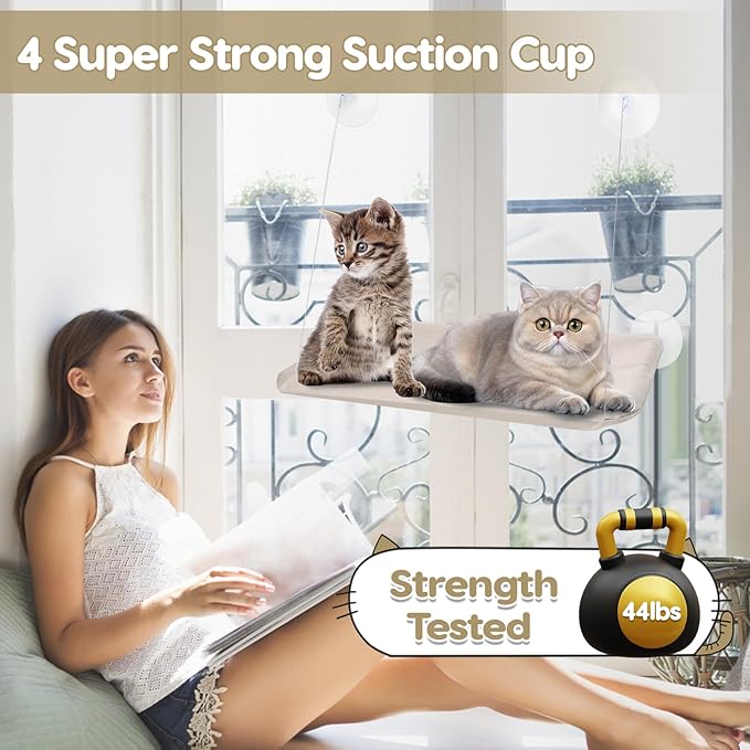 Cat Window Perch, Hanging Cat Hammock for Window, Foldable Cats Windows Bed with 4 Suction Cup, Windows Hammock for Cats Inside Perch Hold up to 44 Pounds Two Pets (Khaki, L)