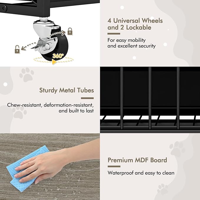 - [Smooth Mobility & Easy Cleaning]: Equipped with four rolling wheels, including two lockable ones for stability, the heavy-duty dog crate also features a pull-out tray that catches dirt and spills, making maintenance effortless.