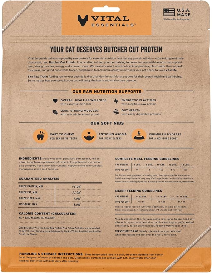- SOFT NIBS FREEZE-DRIED RAW PORK CAT FOOD: Vital Essentials Freeze Dried Cat Food packs more protein than industry standard into every soft bite to deliver the peak vitality your cat deserves, especially when compared to dehydrated cat food. Our complete and balanced freeze-dried raw cat food is made with Butcher Cut premium pork, responsibly sourced in the USA.