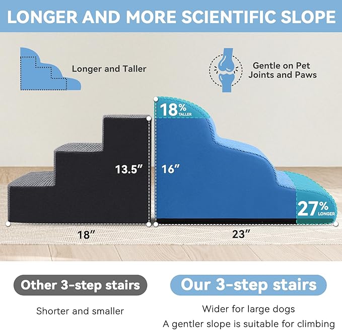 - Specific & Durable Design: Low angle slope design reduces the pressure on joints when pets jump up and down from high bed, sofa, chair and car. Portable handle makes moving stairs easily at home or taking a trip with your pet. The non-slip bottom keeps the stair firmly planted on the ground. No more worrying about your pet slipping and getting hurt! Our foam stair is an essential part of your beloved pet's life! It combines functionality, safety, and durability in one stylish package!