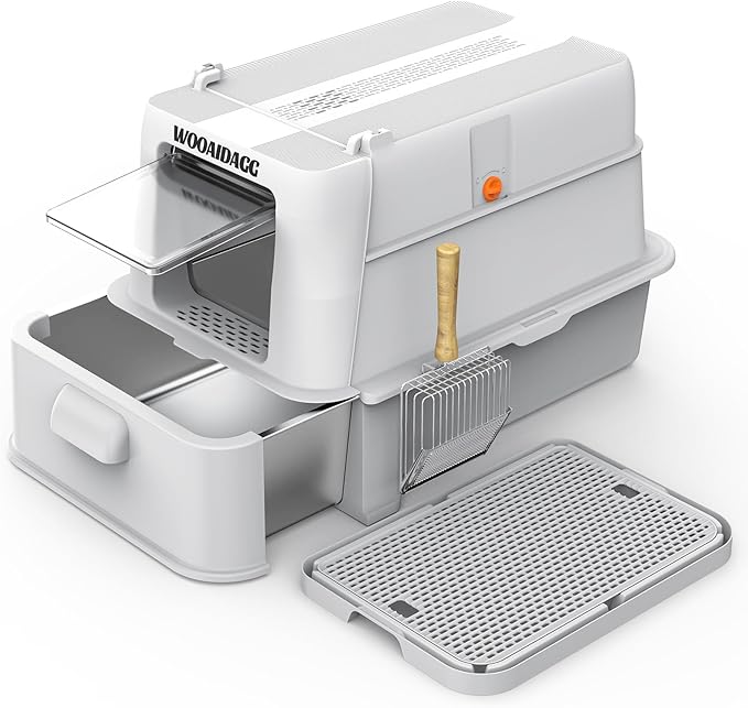 - Effortless Cleaning & Maintenance The Wooaidagg cat litter box features a fully enclosed design to prevent urine leakage and keep your home clean. The pull-out stainless steel tray is rust-resistant, stain-proof, and allows for quick scooping and litter replacement, making maintenance hassle-free