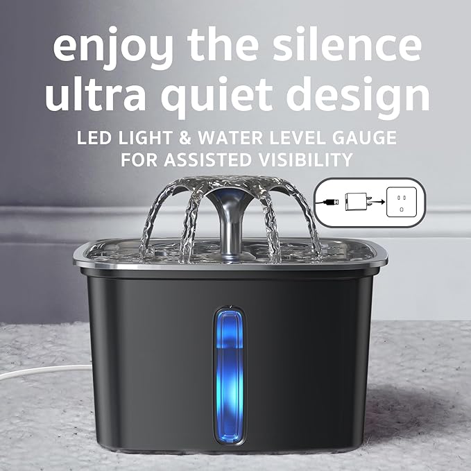 - Large Capacity Water Tank. Worry less about your furry friend running out of water. Our pet fountain features a generously sized water reserve tank to help you avoid frequent refilling, ensuring your pets are healthy, hydrated, and happy.