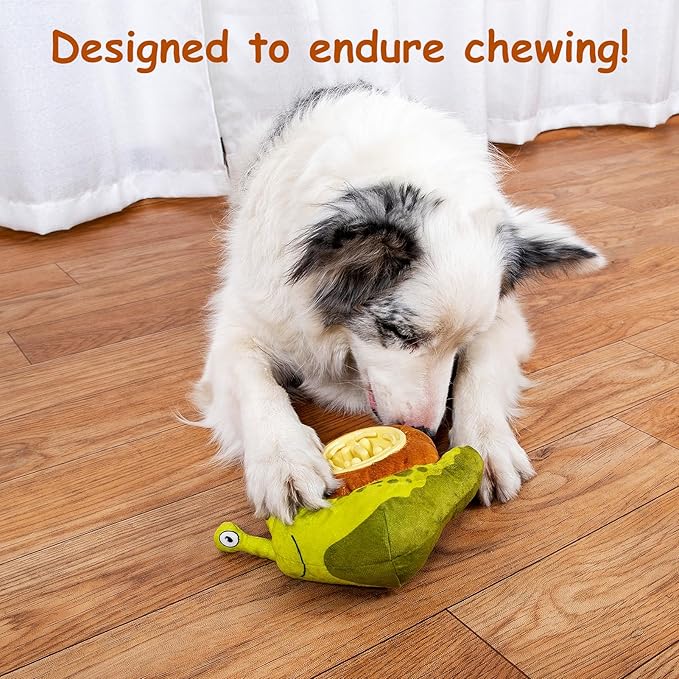 - Plush Dog Toy - This squeaky pet toy is a delightful creation in a cartoon snail. It's made of soft short plush fabric. The natural rubber slow feeder bowl built-in is no harmful substance,ensures a worry-free playtime.