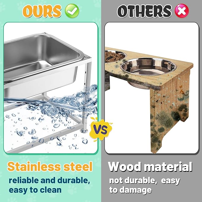 - Durable & Stable: Crafted from thick stainless steel, our raised dog bowl is rust-resistant, durable, and odor-free, designed to last for years. The strong metal stand offers dependable support, while the anti-slip pad on the bottom keeps the bowl in place, minimizing the risk of spills or tipping during mealtime.